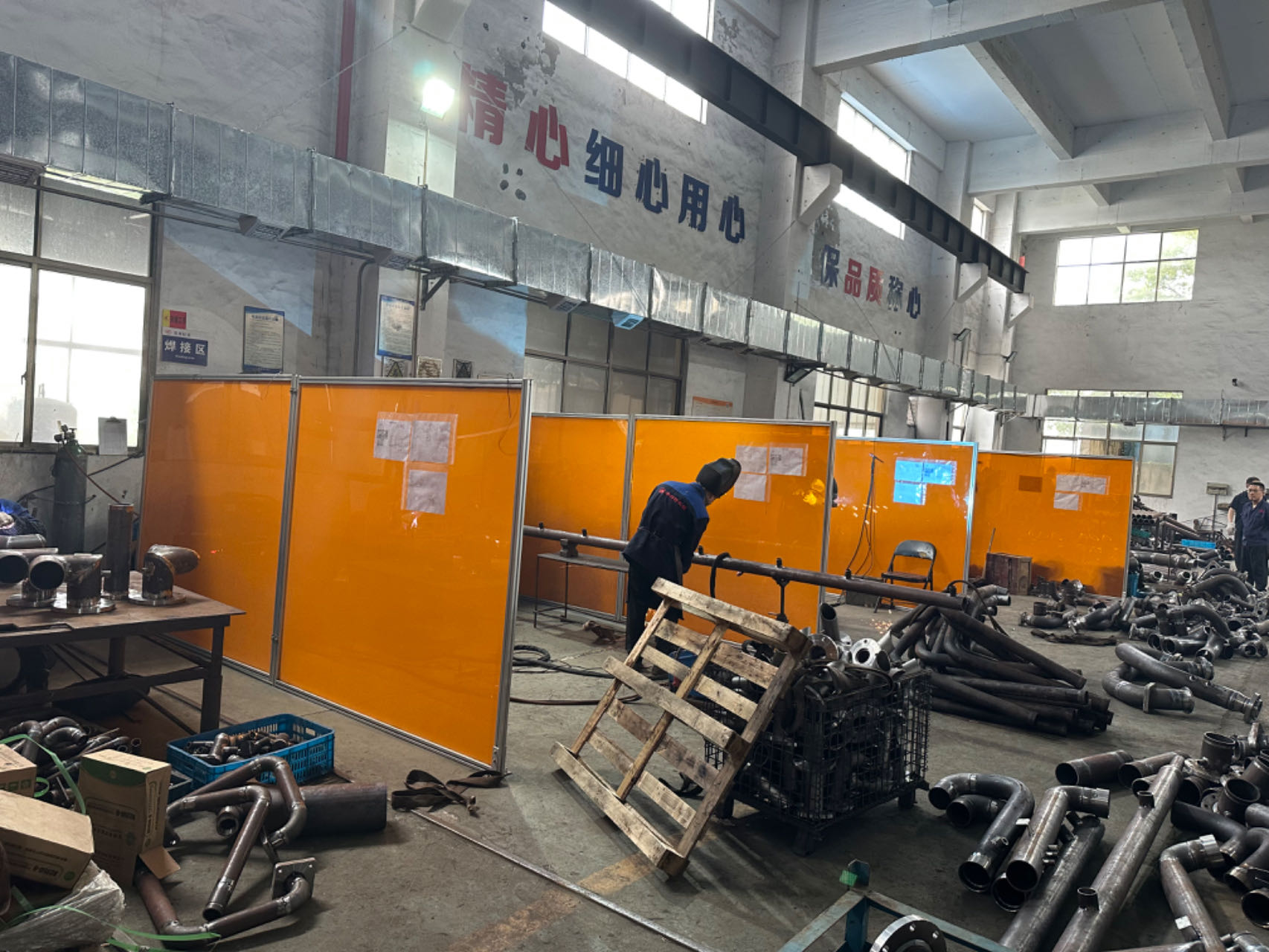 焊接防护屏围栏、焊接防护板围挡、工位焊接防护帘、机器人智能防护门、设备联动防护门、快速卷帘门、车库保温卷帘门等产品设计制作。